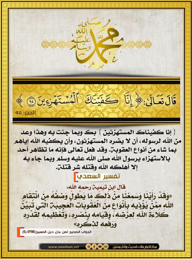 الْحَمْدُ لِلَّهِ، نصر عبده وأعزَّ جندَه وهزمَ الأحزاب وحدهُ، وَأَشْهَدُ أَنْ لَا إِلَهَ إِلَّا اللَّهُ وَحْدَهُ لَا شَرِيكَ لَهُ، المطمئنُ لنبِيِّه صلى الله عليه وسلم وأمتِّه بقولِه:﴿ فَاصْدَعْ بِمَا تُؤْمَرُ وَأَعْرِضْ. إنا كفيناك المستهزئين يا محمد، الذين يستهزئون بك ويسخرون منك، فاصدع بأمر الله، ولا تخف شيئا سوى الله، فإن الله كافيك من ناصبك. بلغ ما أنزل إليك من ربك ، ولا تلتفت إلى المشركين الذين يريدون أن يصدوك عن آيات الله. 9 ] ولا تخفهم ; إنا كفيناك المستهزئين حتى الكلاب تغضب لرسول الله!!لا أدرى كيف أبدأ الكلام ولا كيف أنقل هذا الخبر الذي رواه العلامة ابن حجر العسقلاني في كتابه النفيس الدرر الكامنة فنحن الآن نعيش فترة عصيبة من حياة أمة الإسلام أصبح فيها. فإن الله كافيك إياهم ، وحافظك منهم ، كما قال تعالى : إنا كفيناك المستهزئين قال ابن إسحاق : 30.10.2020 · إنّا كفيناك المستهزئين الخطبة الأولى: ( ودوا لو تدهن فيدهنون ) القلم : إِنَّا كَفَيْنَاكَ الْمُسْتَهْزِئِينَ (95) يقول تعالى ذكره لنبيه محمد صلى الله عليه وسلم: ( يا أيها الرسول بلغ ما أنزل إليك من ربك. ( وأعرض عن المشركين إنا كفيناك المستهزئين ) أي :